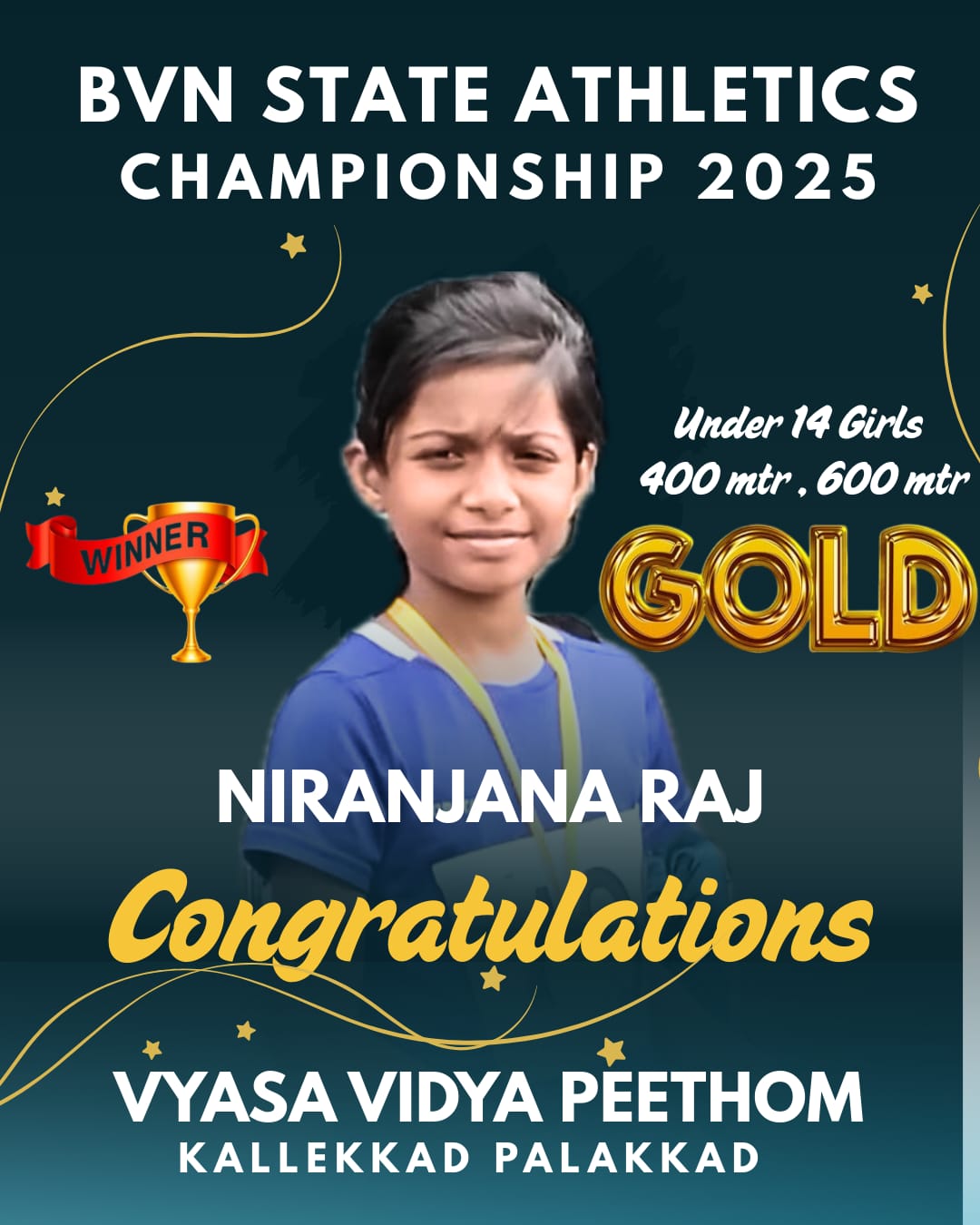 Kum. Niranjana Raj of Vyasa Vidya Peethom has secured Gold medal under 14 girls 400 mts and 600mtr.
